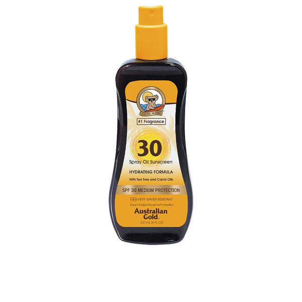 Australian Gold Sunscreen SPF30 Spray-Öljy on kosteuttava aurinkosuojaspray, joka sisältää porkkanaöljyä ja muita ravitsevia ainesosia. Tämä 237 ml suihkeöljy suojaa ihoa auringon UVA- ja UVB-säteiltä, samalla kosteuttaen ja jättäen ihon pehmeäksi. Nopeasti imeytyvä koostumus ei jätä ihoa rasvaiseksi ja on vedenkestävä, tarjoten tehokasta suojaa auringolle altistettaessa.
