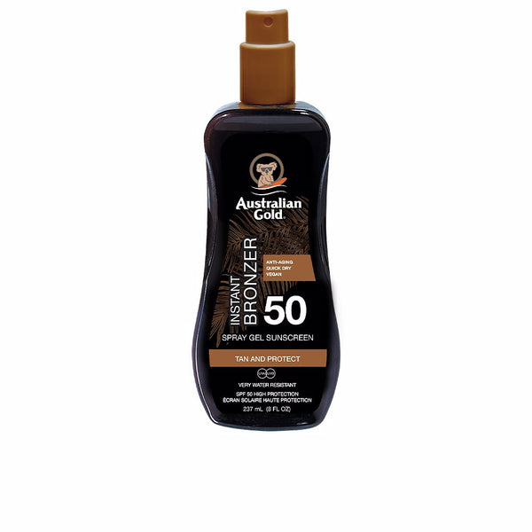 "Australian Gold Sunscreen SPF50 Spray Gel Heti Vaikuttavalla Rusketusvoiteella (237 ml) on korkean suojakertoimen omaava aurinkosuojasuihke, joka yhdistää tehokkaan UVA- ja UVB-suojan rusketusta edistäviin ainesosiin. Kevyt geelimäinen koostumus levittyy iholle helposti eikä jätä tahmeaa tunnetta. Tuote sisältää luonnollisia ainesosia, kuten aloe veraa ja E-vitamiinia, jotka kosteuttavat ja rauhoittavat ihoa. Sopii kaikille ihotyypeille."