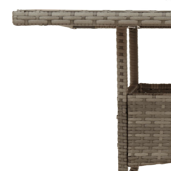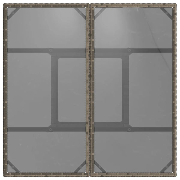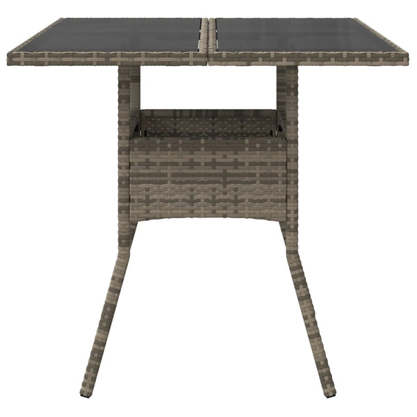 Harmaa puutarhapöytä 80x80x75cm lasilevyllä polyrottinki