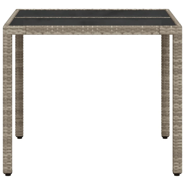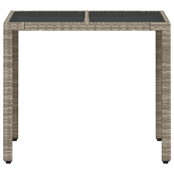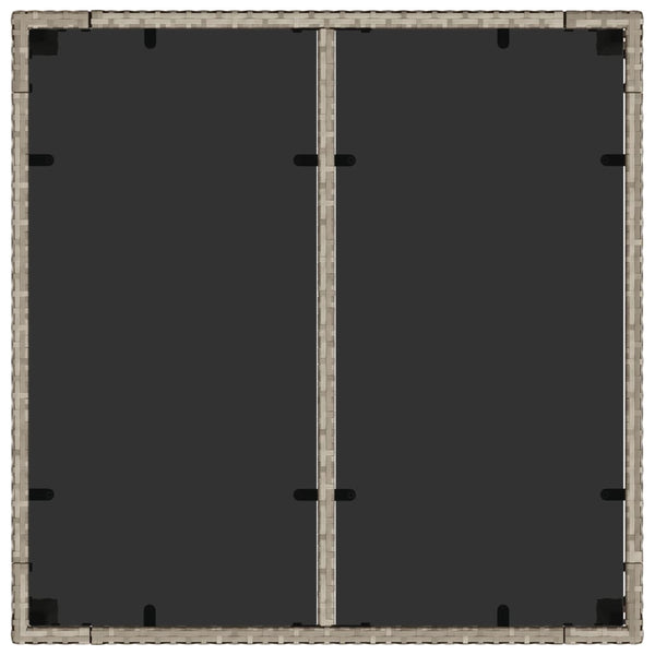 Harmaa puutarhapöytä 90x90x75cm lasilevyllä polyrottinki