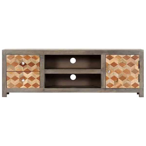 1 ovella, 2 vetolaatikolla ja 2 osastolla varustettu TV-taso tarjoaa runsaasti säilytystilaa. Tämä TV-taso on käytännöllinen ja koristeellinen lisä olo- tai makuuhuoneeseesi. Täydestä mangopuusta valmistettu hifi-kaappi on hiottu, maalattu ja lakattu kauniin ja hienostuneen tyylin luomiseksi. Timantinmuotoiset kuviot ovessa ja laatikoissa tuovat oman lisänsä TV-tason kauneuteen. TV-kaappi on helppo koota ja puhdistaa kostealla liinalla pyyhkien.