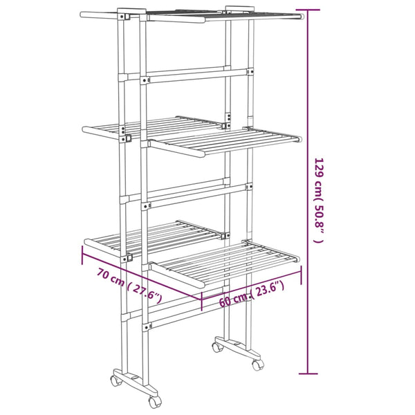 Hopea pyykinkuivausteline 60x70x129cm 3-kerroksinen, pyörillä
