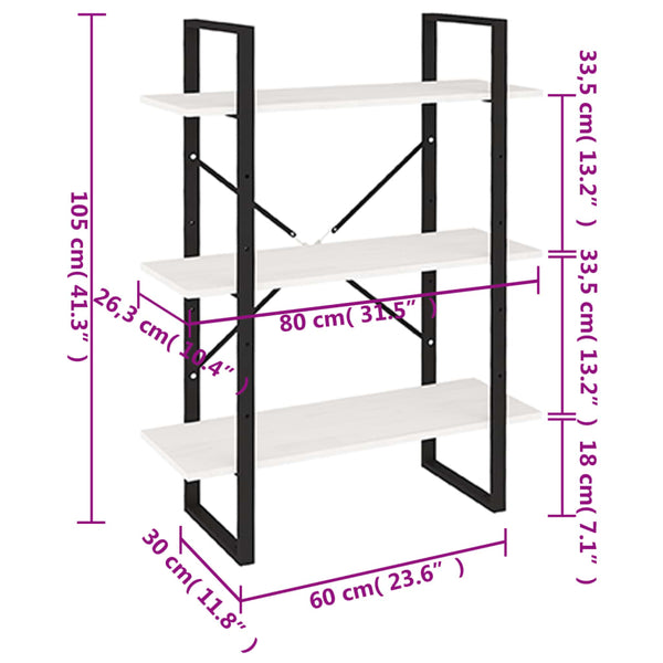 Valkoinen kirjahylly 80x30x105cm 3-tasoinen, mänty
