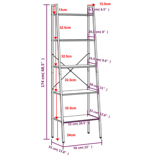 Musta lattiahylly 56x35x174cm 5-kerroksinen