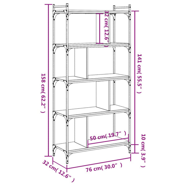 Ruskea tammi kirjahylly 76x32x158cm 5 kerrosta, puinen