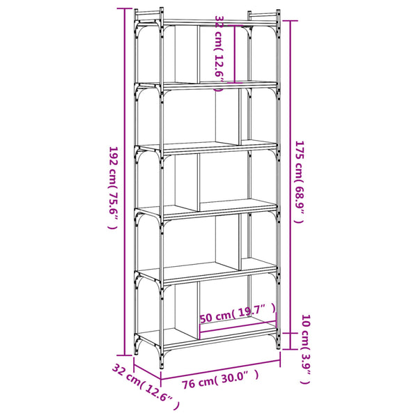 Sonoma-tammi kirjahylly 76x32x192cm 6 kerrosta, puinen