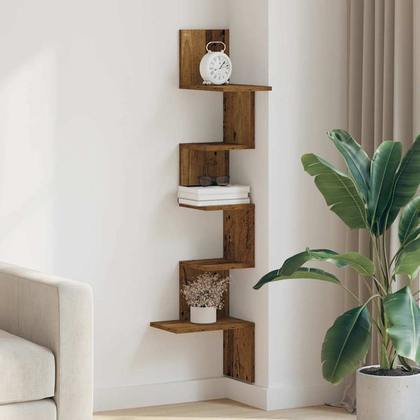 Vanha puu seinäkulmahylly 32x32x127,5cm lastulevy