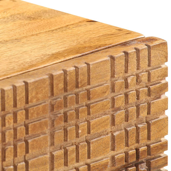 Tämän senkin etuosassa on käsin kaiverrettu ristikko kuviointi. Senkki on valmistettu täydestä mangopuusta, joka on tiheä ja tukeva kovapuu, jonka pinnassa on kauniita ruskean ja kullan värisiä raitoja ja kuvioita. Valmistuksen jokainen vaihe on suoritettu todella huolellisesti, olipa se sitten kiillotus tai lakkaus; käsityön taito lisää sen upeaa retrotyyliä. Kauniit puun kuviot tekevät jokaisesta huonekalusta ainutlaatuisen ja hieman toisista poikkeavan. Jauhemaalattu teräsrunko lisää senkkiin teollista tyyliä. Kaapissa on kolme laatikkoa, jotka tarjoavat runsaasti tilaa pienten esineiden säilyttämiseen ja kättesi ulottuvilla pitämiseen. Tuote on helppo koota.