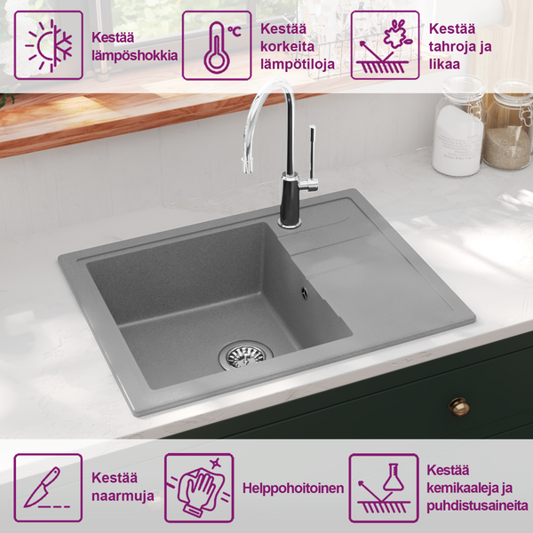 Tämä graniittinen tiskiallas on ajaton lisä keittiösi sisustukseen. Siinä on yksi, erityisen syvä allas ja tyylikäs muotoilu.