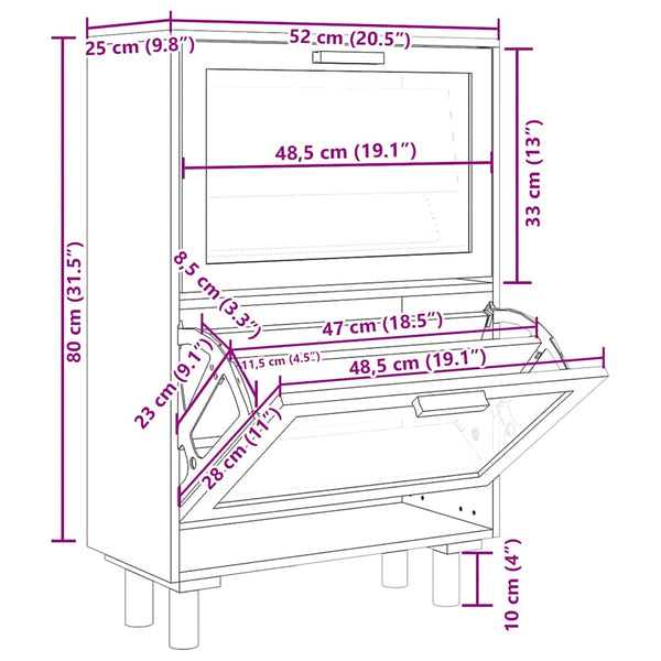 • Runsaasti säilytystilaa: Kenkäkaapissa on kaksi laatikkoa, joten se tarjoaa runsaasti tilaa kenkien pitämiseen kättesi ulottuvilla ja hyvässä järjestyksessä. Laatikon luonnollinen punottu rottinkikuvio lisää sen kauneutta.