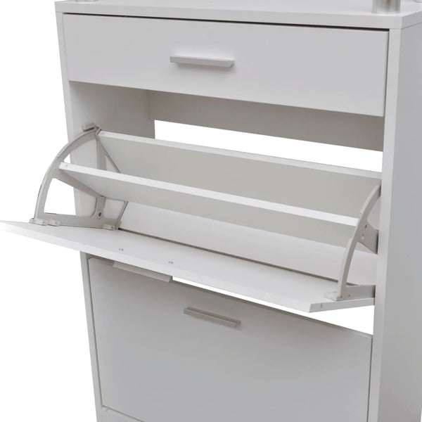 Valkoinen kenkäkaappi vetolaatikolla ja lasihyllyllä puu