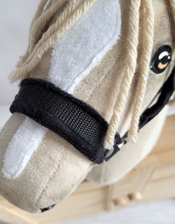 Laadukkaat materiaalit: Riimu on valmistettu 1,5 cm leveästä, kestävästä hihnasta ja pehmeästä minky-kankaasta, joka lisää mukavuutta ja suojaa keppihevosen pintaa.