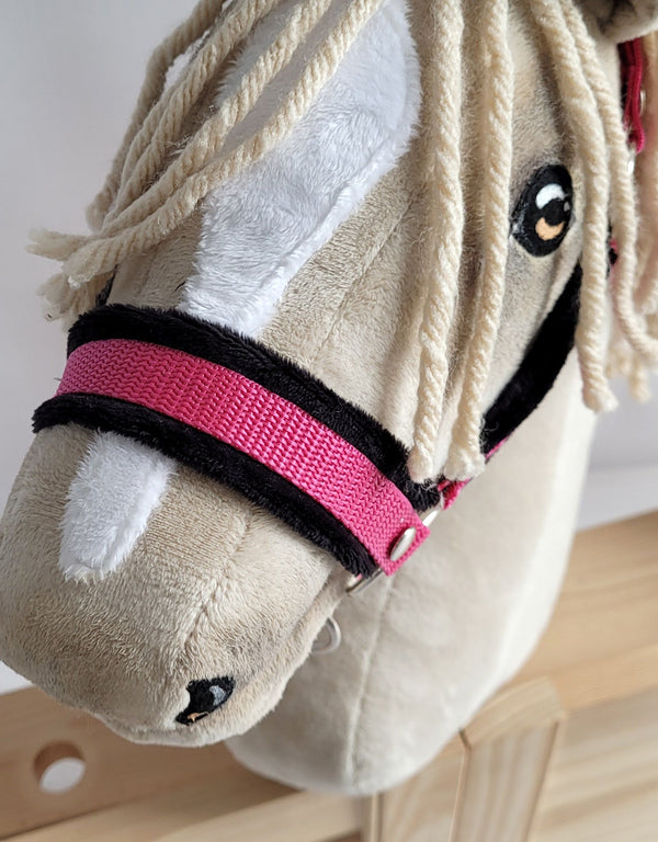 Laadukkaat materiaalit: Riimu on valmistettu 1,5 cm leveästä, kestävästä hihnasta ja pehmeästä minky-kankaasta, joka lisää mukavuutta ja suojaa keppihevosen pintaa.