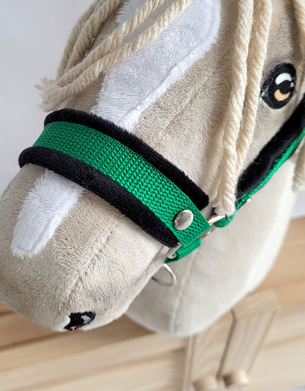 Laadukkaat materiaalit: Riimu on valmistettu 1,5 cm leveästä, kestävästä hihnasta ja pehmeästä minky-kankaasta, joka lisää mukavuutta ja suojaa keppihevosen pintaa.