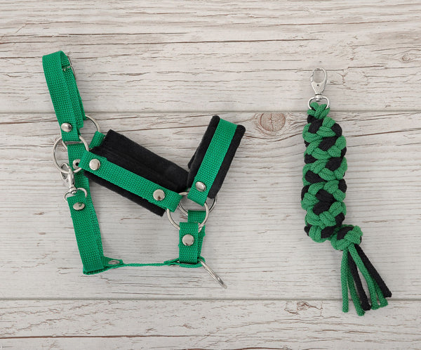 Setti Hobby Hevoselle: säädettävä A3 riimu mustalla turkiksella + kaksinkertaisesta narusta valmistettu kiinnitysnaru mustanvihreällä värillä.