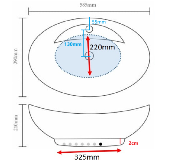 Se on varustettu ylivuotoaukolla veden ulosjohtamista varten, jos allas on liian täynnä ja myös 3,5 cm hanareiälläkin hanan asennusta varten. Tyhjennysreikä on halkaisijaltaan 4,5 cm. Huomaa, että hana ja viemäri eivät sisälly toimitukseen.