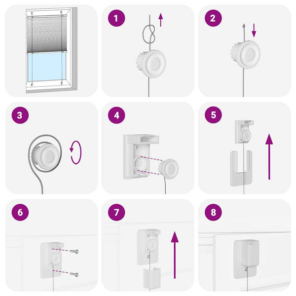 - Kaksi asennustapaa: Voit kiinnittää laskostetun kaihtimen seinään tai ikkunaan ruuveilla tai ilman porausta kiinnityskannattimilla tarpeen mukaan.