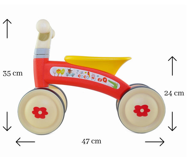 - Mitat: Leveys - 23 cm, Korkeus - 35 cm, Istuinkorkeus - 24 cm, Etäisyys ohjaustangosta istuimeen - 20 cm, Kokonaispituus - 47 cm