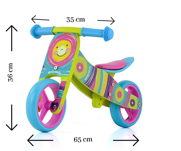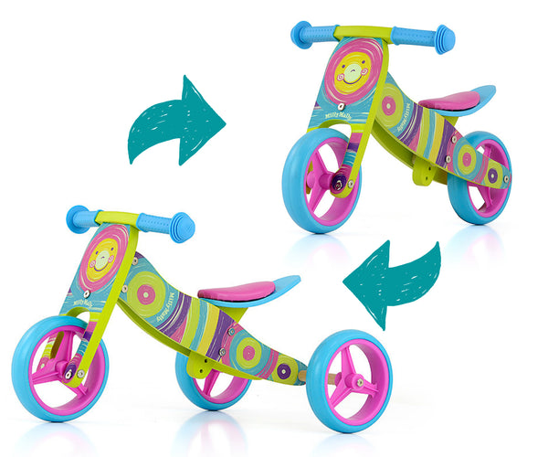 Erinomainen ominaisuus on mahdollisuus muuntaa pyörä kolmipyöräisestä kaksipyöräiseksi juoksupyöräksi. Näin lapsesi nauttii pidempään tämän erikoisen pyörän käytöstä, joka kasvaa hänen mukanaan. Pehmeät liukuestekahvat suojuksilla suojaavat lapsen käsiä, ja säädettävän satulan korkeus mahdollistaa oikean korkeuden säätämisen lapsen pituuden mukaan. Sitä on myös ohjainrajoitin, jotta lapsi ei käännä ohjaimia estäen ajamisen.