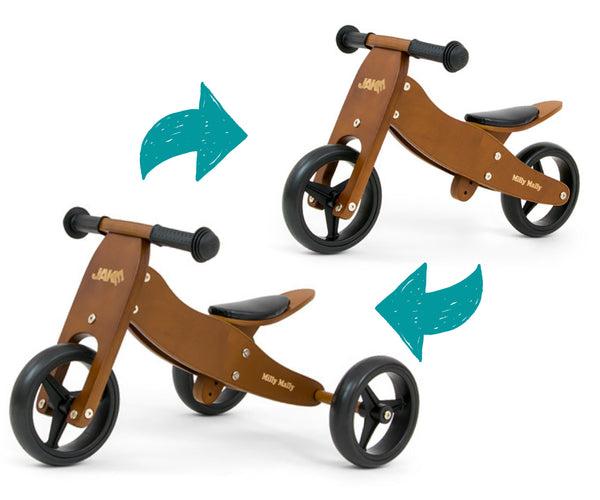 Jake-pyörän kaksitoimisuus mahdollistaa jo 12-kuukautisen lapsen ohjata itse ensimmäistä pyöräänsä.