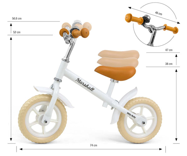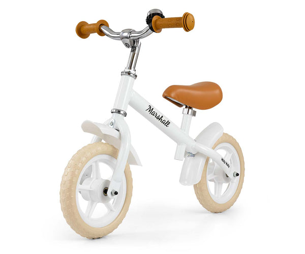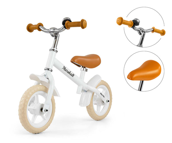 Kestävät, valkoiset vanteet omaavat EVA-vaahtomuovirenkaat ovat kestäviä eikä niitä tarvitse pumpata. Ergonominen satula pehmeällä täytteellä sekä korkeuden säätömahdollisuus kasvaa lapsen mukana.