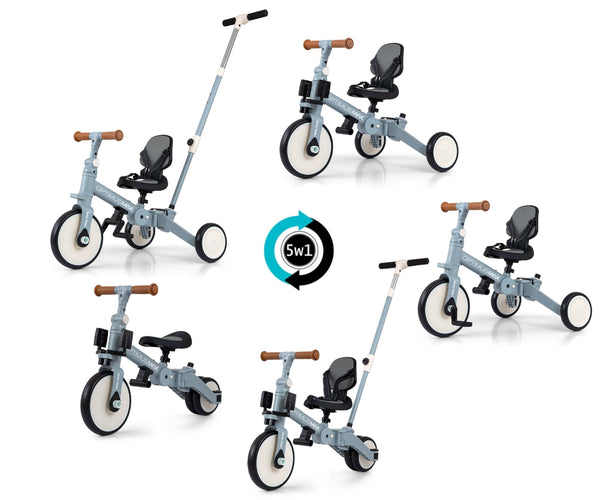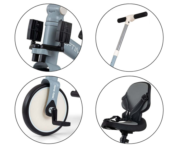 - Kolmipyörä työnnettävällä tangolla ja pedaaleilla, jotka toimivat jalkatukina – ihanteellinen ensimmäisiin ajoharjoituksiin.