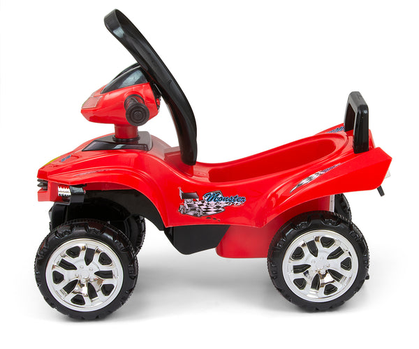 Interaktiivinen kierowania, joka on varustettu musiikillisella paneelilla, innostaa lasta käyttämään potkuautoa aktiivisemmin. Ääniefektit ja värikkäät valot stimuloivat lapsen aisteja ja kehittävät koordinaatiota. Monster potkuauton alla oleva kätevä säilytystila tarjoaa lapselle mahdollisuuden ottaa lempilelut mukaan matkalle, mikä lisää leikin iloa.