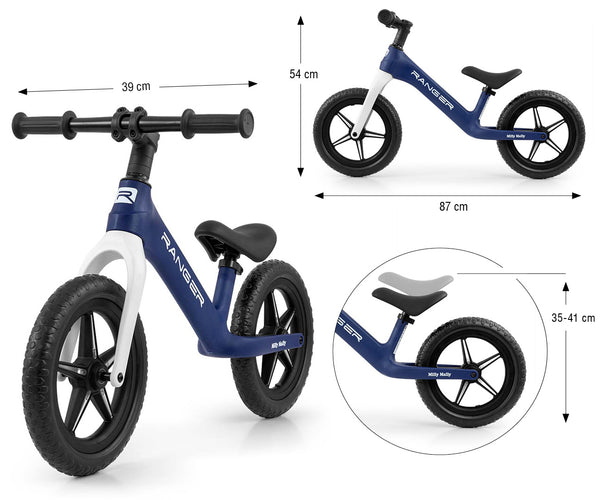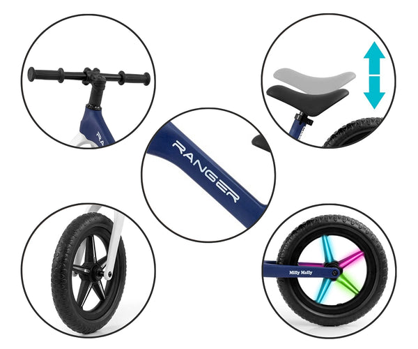 Milly Mallyn Ranger Flash Navy on suunniteltu lasten ergonomia huomioiden. Pyörän kevyt komposiittirunko tekee siitä helpon käsitellä pienillekin lapsille, samalla kun pysyvät ja turvalliset materiaalit takaavat pitkän käyttöiän. Tasapainopyörässä on 12 tuuman EVA-vaahtomuovipyörät, jotka ovat sekä kestävät että huoltovapaat, koska niitä ei tarvitse koskaan pumpata.