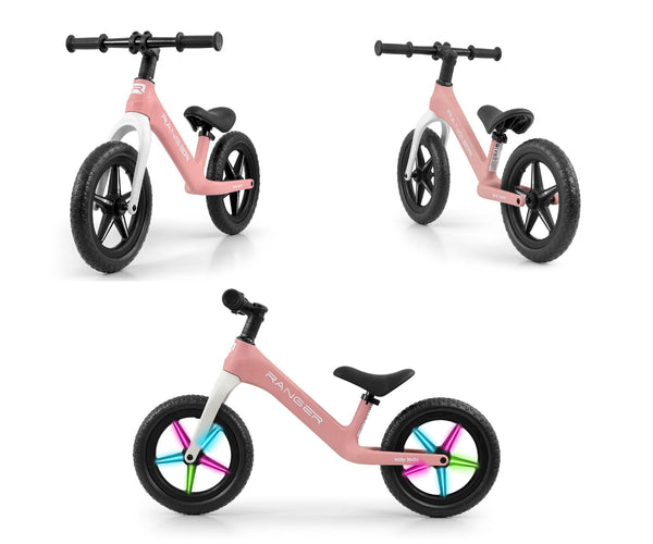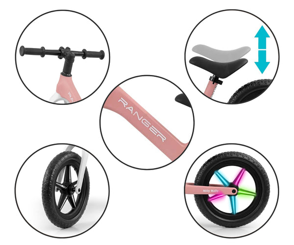 Milly Mally Ranger Flash Pink -tasapainopyörä on valmistettu kestävästä komposiittimateriaalista, joka tekee pyörästä erittäin kevyen (vain 2.8 kg). Pyörässä on useita ominaisuuksia, jotka tukevat lapsen kehitystä ja turvallisuutta. Ergonominen muotoilu ja säädettävä satula takaavat, että pyörä kasvaa lapsesi mukana, kun taas EVA-materiaalista valmistetut 12 tuuman renkaat tarjoavat sujuvan ja mukavan ajokokemuksen ilman renkaiden pumppaamisen tarvetta.