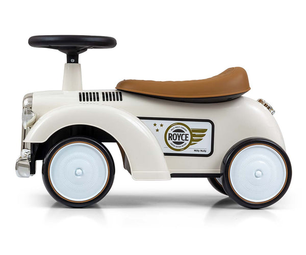 Jokainen yksityiskohta Royce potkuautossa on suunniteltu lisäämään lapsen ajonautintoa. Autossa on tilava istuin, joka tarjoaa mukavuutta pitkissäkin seikkailuissa, ja kätevä säilytystila istuimen alla, johon mahtuvat lempilelut matkaan mukaan. Auton retrohenkinen muotoilu ja tyylikkäät yksityiskohdat, kuten metallinhohtoinen keula ja tyylikäs ROYCE-logo, varmistavat, että se erottuu joukosta.