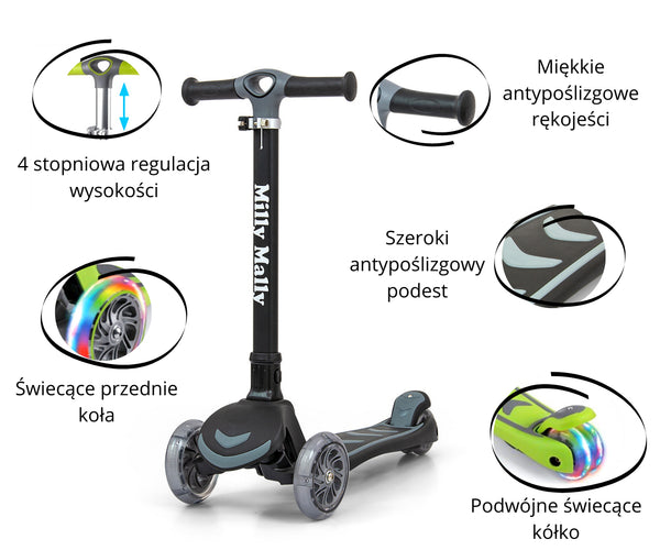 Jos etsit turvallista ja kestävää potkulautaa, joka tarjoaa lapsellesi iloa ja liikunnan riemua, Milly Mallyn Potkulauta Boogie Musta on täydellinen valinta. Tämä kolmipyöräinen potkulauta on suunniteltu erityisesti nuorille seikkailijoille, jotka ovat valmiita tutkimaan maailmaa uudella ja jännittävällä tavalla.Mukavuutta ja turvallisuutta jokaisella ajomatkalla