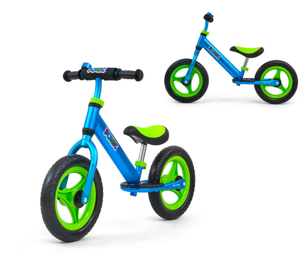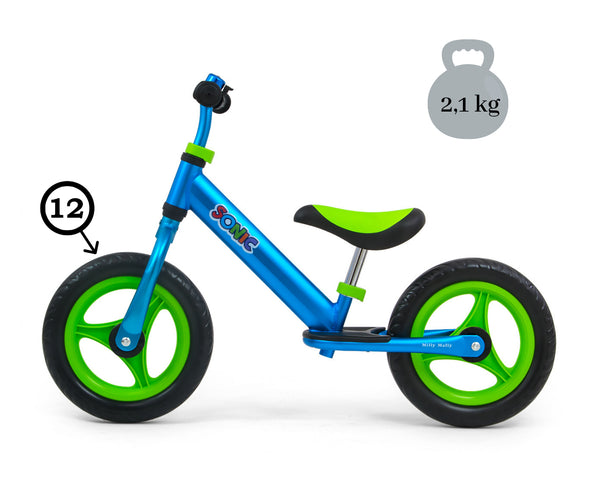 Ansiosta 12 tuuman vanteettomien renkaiden ja leveiden renkaiden, jotka on valmistettu kevyestä vahvistetusta materiaalista ja jotka takaavat vakauden ja turvallisuuden eri pinnoilla, pienokaisesi oppii nopeasti ylläpitämään tasapainoa. Säädettävä ohjaustanko ja ergonomisesti muotoiltu satula mahdollistavat korkeuden optimaalisen säätämisen, jonka ansiosta polkupyörä "kasvaa" nuoren pyöräilijän mukana. Liukastumattomat kädensijat suojuksilla suojaavat käsiä. Lisäksi satulan alla oleva taso tarjoaa tukea jaloille ajaessa.