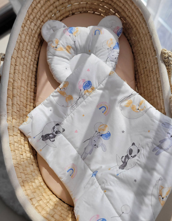 👶 My Sweet Baby -vuodesetti tarjoaa mukavuutta ja turvallisuutta vauvallesi. Tämä laadukas käsintehty vuodesetti sisältää täytetyn peiton ja suloisen nallemuotoisen tyynyn, jotka on valmistettu 100 % Ökotex-sertifioidusta puuvillasta.