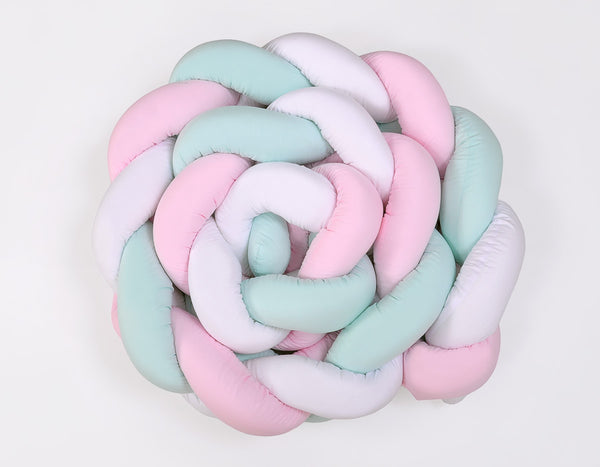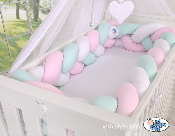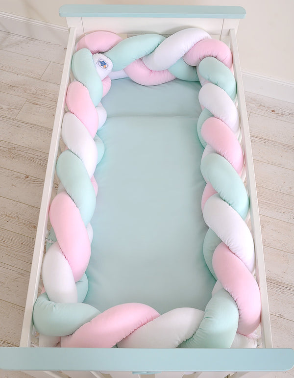 Valitse tämä kaunis ja käytännöllinen letitetty reunapehmuste, joka lisää pinnasängyn turvallisuutta ja tekee vauvan huoneesta entistäkin kodikkaamman!