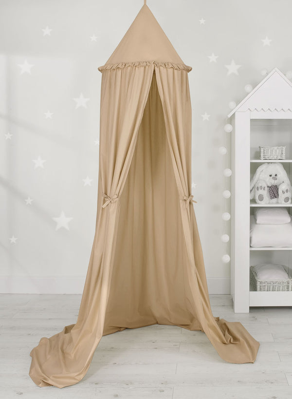 Korkeutensa ansiosta (260 cm) katos voidaan asettaa lattialle, luoden lapsille ihanan leikkiteltan tai piilopaikan. Kätevien sivunauhojen avulla voit sitoa kankaan kauniisti ja muotoilla siitä haluamasi kokonaisuuden.
