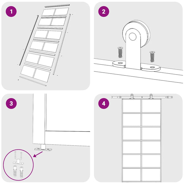 Ovi voidaan asentaa vain yhdessä liukuoven asennussarjan kanssa. Löydät yhteensopivat liukuoven asennussarjat kaupastamme (SKU: 145262-145263). Asennustavan varmistamiseksi voit lukea ohjekirjamme ovesta ja liukuoven asennussarjasta.