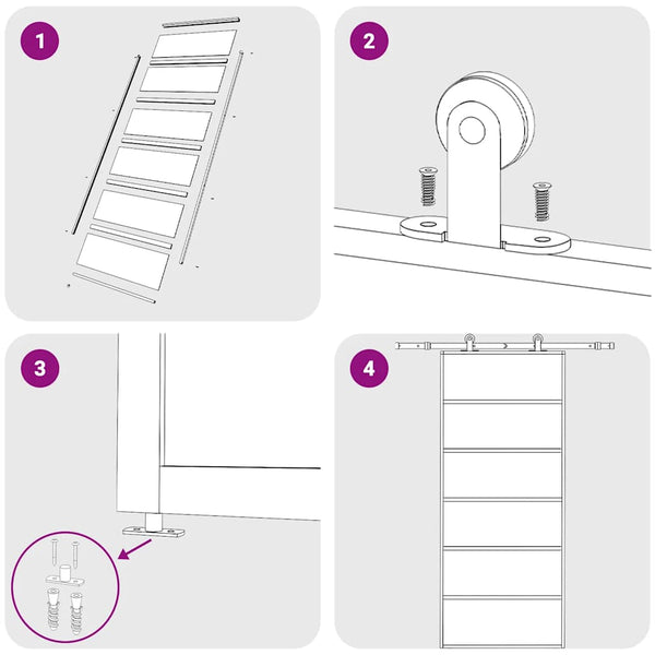Ovi voidaan asentaa vain yhdessä liukuoven asennussarjan kanssa. Löydät yhteensopivat liukuoven asennussarjat kaupastamme (SKU: 145262-145263). Asennustavan varmistamiseksi voit lukea ohjekirjamme ovesta ja liukuoven asennussarjasta.