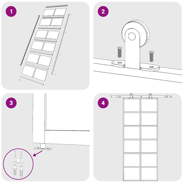 Ovi voidaan asentaa vain yhdessä liukuoven asennussarjan kanssa. Löydät yhteensopivat liukuoven asennussarjat kaupastamme (SKU: 145262-145263). Asennustavan varmistamiseksi voit lukea ohjekirjamme ovesta ja liukuoven asennussarjasta.
