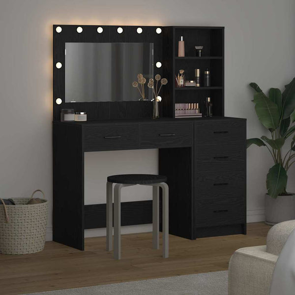 • Sisältää: Mukana LED-nauvalamput, jotka valaisevat tilan ja tarjoavat joustavan valaistuksen tarpeidesi mukaan. Tarvitsetpa kirkasta valoa valmistautuessasi tai pehmeämpää valoa rentoutuessasi, nämä valot palvelevat sinua. Lisäksi laatikot ja hyllyt tarjoavat älykästä säilytystilaa ilman, että pöytä menee tukkoon.