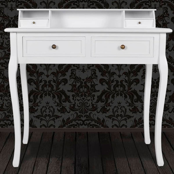 Tämä kaunis meikkipöytä tulee piristämään makuuhuonettasi tai pukuhuonettasi! Meikkipöydässä on kaksi vetolaatikkoa pöytälevyn päällä, joihin voit laittaa arvoesineesi. Lisäksi, pöydän alla on vielä kaksi täysimittaista ylimääräistä vetolaatikkoa säilytystä varten. Vetolaatikot voidaan poistaa helposti puhdistusta varten. Pehmeän valkoinen pinta ja upeat muodot saavat sen vaikuttamaan todella arvokkaalta ja tyylikkäältä. Tämä lista sisältää yhden meikkipöydän. Valikoimassamme on monia meikkipöydän kanssa yhteensopivia tuotteita kuten jakkara, peili ja paljon muuta! Ota huomioon, että tämä huonekalu on käsintehty, valmistettu puusta ja maalattu valkoiseksi, joten pienet virheet voivat olla mahdollisia.