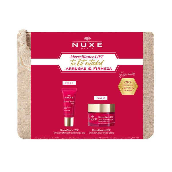Nuxe Merveillance Lift -setti sisältää ikääntymistä vastaan taistelevan päivävoiteen ja silmänympärysvoiteen. Tuotteet on suunniteltu vahvistamaan ihoa ja tasoittamaan juonteita, hyödyntäen luonnon omia ainesosia. Päivävoide kosteuttaa ja kiinteyttää ihon rakennetta, kun taas silmänympärysvoide auttaa vähentämään tummia silmänalusia ja turvotusta. Setti tarjoaa kokonaisvaltaisen hoitoratkaisun kasvoille ja silmänympärysiholle.