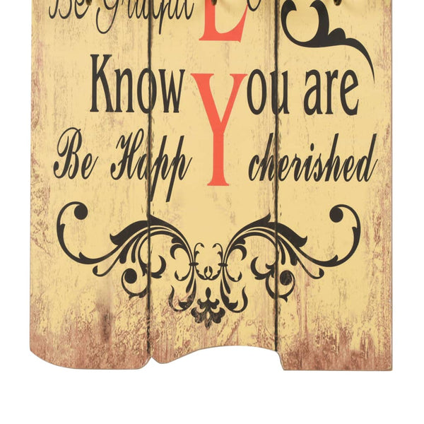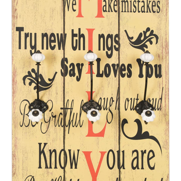 Vintage-tyylisessä painatuksessa lukee: "Be thankful Always forgive Share Respect one another Show compassion We make mistakes Try new things Say I love you Be grateful Laugh out loud Know you are cherished Be happy." Kuusikoukkuinen seinänaulakko on todellinen katseenvangitsija, jonka vieraat huomaavat välittömästi.