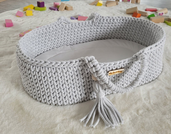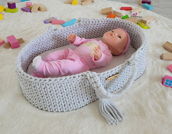 Kaunis BOHO-tyylinen Moses-kori nukkeille! Tämä tyylikäs pienoismalli BOHO vauvan Moses-korista tuo iloa jokaiselle pikkutytölle! Tämä 100% puolalainen käsintehty tuote sopii täydellisesti jokaiseen pikkutytön huoneeseen. Se on myös täydellinen syntymäpäivälahja. Moses-kori on valmistettu käsin puuvillanarusta. Korin sivut on huolellisesti kudottu paksusta ja korkealaatuisesta narusta. Erityinen kudos takaa, että sivut ovat vakaita, eivät muodonmuutu ja tuntuvat pehmeiltä ja miellyttäviltä kosketukselta. Pitkät kahvat tekevät Moses-korin käytöstä ja kuljettamisesta helppoa, ja sitä voi käyttää myös nukkejen kantamiseen. Kahvassa on myös pitkä koristeellinen kahva samasta narusta, joka on koristeltu puuhelmellä. Moses-korin jäykkä ja vakaa pohja on valmistettu valkoisesta levystä, ja pohja on luonnollisen värinen. Moses-kori toimitetaan valkoisella patjalla, joka on pehmeää kauraa ja viimeistelty valkoisella puuvillakankaalla. Lisäksi valikoimastamme löydät kauniita värikkäitä pinnasänkyjä, nukkien vuodevaatteita ja kartioita, jotka sopivat täydellisesti Moses-koreille nukkeja varten. Meiltä saat kauniin kokonaisuuden rakastetuille nukeillesi, mikä tekee kotileikeistä vieläkin parempia. Mitat: - pituus - 47 cm - leveys - 29 cm - korkeus - 13 cm