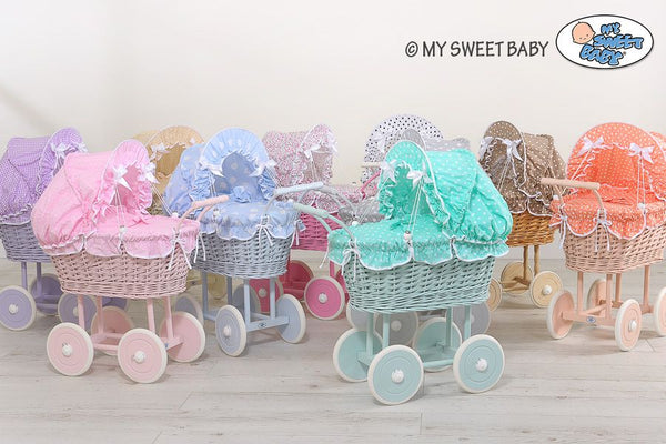 Etsitkö kaunista ja tyylikästä lahjaa pienelle tytölle? Tämä upea punaiseksi maalattu punaisella vuorella varustettu rottinkinen nukkekärry on täydellinen valinta! MY SWEET BABY -nukkekärry on käsintehty huippulaatuinen tuote, joka on valmistettu luonnonmukaisesti viljellystä puolalaisesta rottinkista. Kärryn kaunis pyöristetty muoto ja luonnollisesta pyökkipuusta valmistettu vankka runko tekevät siitä todella silmiähivelevän.