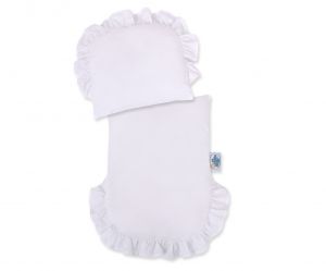 🛏 Pehmeä nukkevuode, jossa tyyny ja röyhelöreunainen peitto