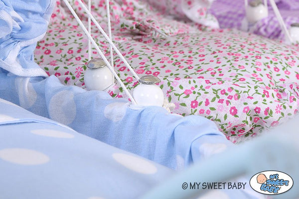 Kärryyn kuuluu myös kaunis nukkien vuodevaatesetti, jossa on röyhelöreunainen peitto. Koko kärry on lisäksi vuorattu puuvillapehmusteella. Turvallisuuden varmistamiseksi kärryn sisusta ja reunat on suojattu tyylikkäällä vuorilla, jossa on röyhelö ja kanttaus. Liikuteltava kangaskatos on kauniisti koristeltu ruseteilla.
