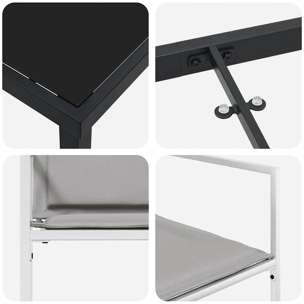 - Kestävä Jauhemaalattu Runko: Rakenne on tehty jauhemaalatusta teräksestä, jolloin setti osoittaa voimaa ja vakautta, kestäen päivittäistä käyttöä ja vaihtelevaa säätilaa. Sen vahva rakenne takaa tarvittavan rakenteen vakauden, jotta voit nauttia mukavista ruokailuhetkistä avonaisessa taivaan alla.