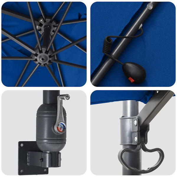 • LED-valaistus: Varjossa on LED-valoja, jotka on piilotettu kankaan alle – loistavaa tunnelmavalaistusta iltakäyttöön. Ne toimii aurinko- tai paristokäyttöisesti ilman sotkuisia kaapeleita.