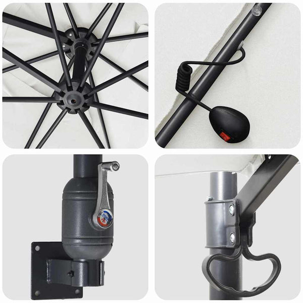 - Kallistusmekanismi: Käsikahvalla varustettu varjo avautuu ja sulkeutuu helposti, mikä on sairaan kätevää varjon saamiseksi tarpeen mukaan. Kallistusominaisuus auttaa myös säätämään kangasta auringon suuntaan, joten pysyt mukavana riippumatta siitä, kuinka kirkasta on.