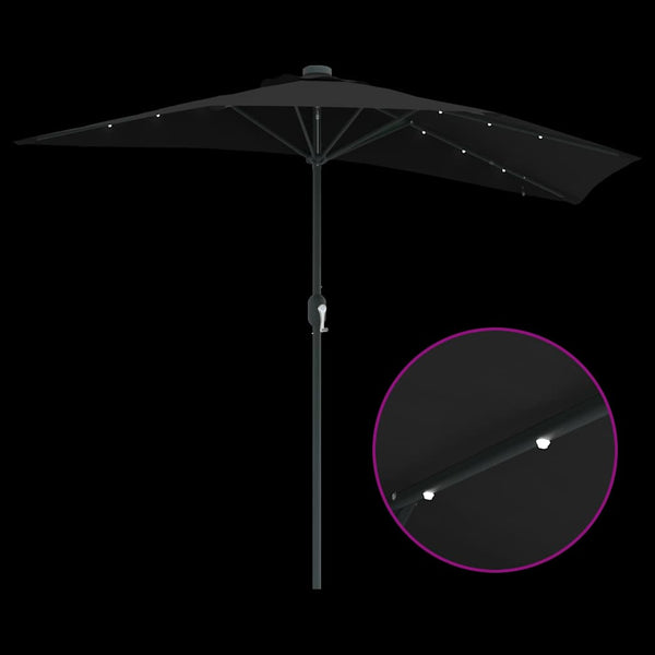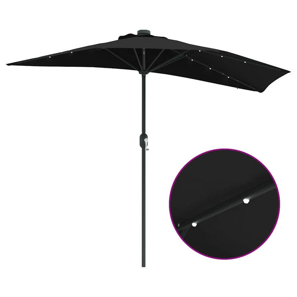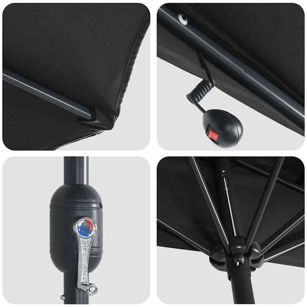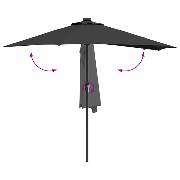 - LED-valot: Varustettu kätevillä LED-valoilla, tämä varjo valaisee ulkoilmatapahtumasi yöllä. Aurinkovoimaiset LED-valot ovat ympäristöystävällisiä ja antavat pehmeää valoa, joka sopii täydellisesti iltakokoontumisiin.